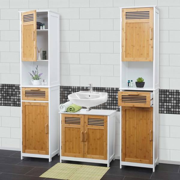 Of het nu gaat om een haardroger, tandenborstel, handdoek, shampoo of zeep: de combinatie van twee hoge kasten en een badmeubel biedt voldoende opbergruimte voor de dingen die je 's ochtends snel nodig hebt. Je zult zeker complimenten krijgen van elke (on)aangekondigde overnachtende bezoeker. Het bamboe materiaal is ook visueel en kwalitatief uitstekend: het gebruik van deze snel hernieuwbare natuurlijke grondstof draagt bij aan de bescherming en verantwoorde omgang met het milieu.