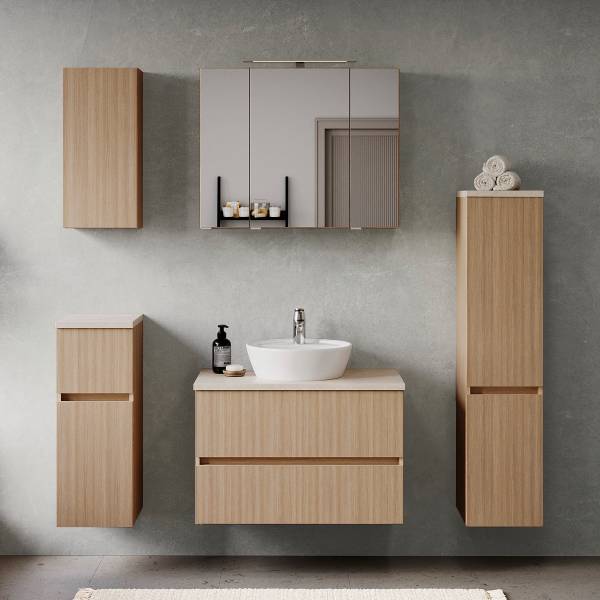 - Badkamerset bestaande uit 1 wastafel inclusief opzet-wasbak van keramiek, 1 halfhoge kast, 1 onderkast, 1 wandkast & 1 spiegelkast incl. LED-opzetlamp
