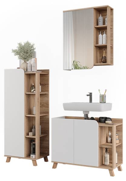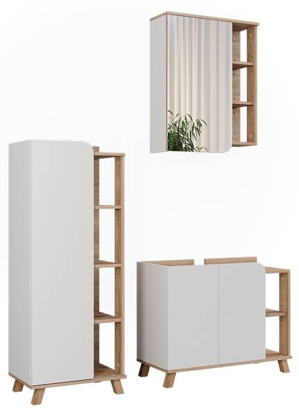 OVERZICHT VAN LEVERING: Badmeubel, badkamerspiegelkast, midikast, montagehandleiding, montagemateriaal (decoratie niet inbegrepen)