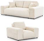 De 3-zitsbank en de fauteuil zijn bekleed met luxe pluchecord-stof, bekend om zijn zachtheid en uitnodigende textuur, en bieden een uitzonderlijk zitcomfort. Gemaakt van hoogwaardige materialen en uitgerust met duurzame golfveren, zorgen ze voor uitstekende stabiliteit, langdurige duurzaamheid en optimaal comfort.