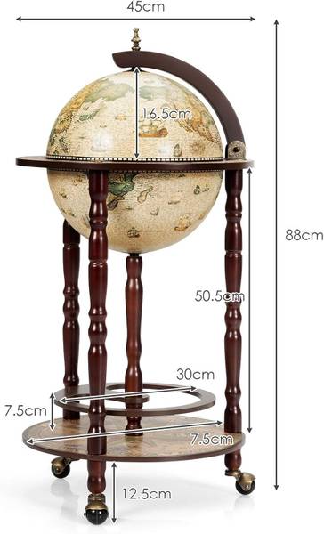 Deze elegante wereldbol is ideaal voor meerdere flessen en glazen. Een huisbar op wieltjes voor thuis, op kantoor of waar je gasten wilt ontvangen. Dit wijnrek is zeer speciaal. De wereldbol heeft een wereldbol zoals op de foto's te zien, waarin je niet alleen wijnflessen maar ook wijnglazen kunt leggen. Je kunt ook enkele prachtige dingen zoals de bloemen erin verstoppen om een verrassing voor de liefde te geven. Door de 3 wielen kun je de barwagen probleemloos vervoeren. De wereldbol is van kunststof om te openen. Deze sieradenkast is de ideale keuze.