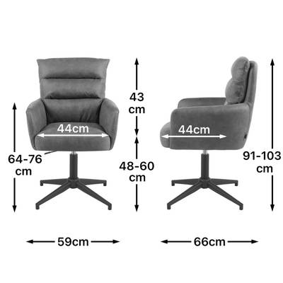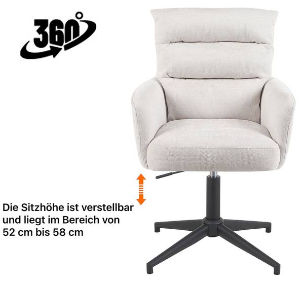Dankzij de royale bekleding met zachte stof in aantrekkelijke kleuren (grijs, crème, taupe) geniet u van ontspannen zitcomfort, ook gedurende meerdere uren. De geïntegreerde hoogteverstelling en de 360° draaifunctie zorgen voor maximale flexibiliteit in het dagelijks gebruik.