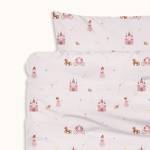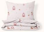 De set bestaat uit een dekbedovertrek van 120 x 150 cm en een bijpassende kussensloop van 50 x 60 cm. Het dekbedovertrek is voorzien van een praktische instopstrook die ervoor zorgt dat het netjes om het dekbed blijft zitten. De subtiele prinsessen- en kasteelmotieven maken het een charmante keuze, terwijl de ademende en zachte stof zorgt voor een comfortabele nachtrust.