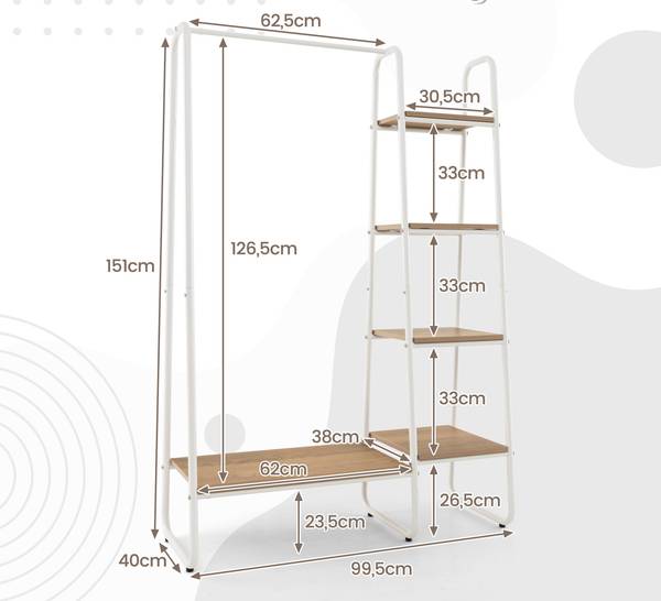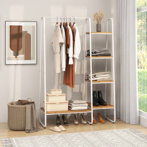 Zoek je een kledingrek voor je huis? Onze functionele kledingstandaard helpt je om verschillende kledingstukken en andere huishoudelijke voorwerpen op te bergen. Deze kledingstandaard van gepoedercoat ijzeren frame en dikke houten planken is duurzaam en kan lang worden gebruikt. Het compacte ontwerp maakt hem geschikt voor beperkte ruimtes, zonder te veel ruimte in te nemen. Bovendien biedt deze 4-traps kledingstandaard met geïntegreerde kledingstang een grote capaciteit voor het plaatsen van kleding. De eenvoudige en chique stijl maakt hem ideaal voor elke ruimte thuis, zoals woonkamer, slaapkamer en garderobe. Deze zorgvuldig vervaardigde kledingstandaard is de ideale keuze.