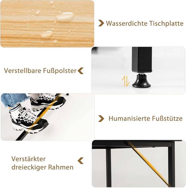 - Stabiele en duurzame structuur: het dikke hout en het stabiele metalen frame garanderen de stabiliteit en het draagvermogen van 75 kg (rek: 20 kg). Bovendien staat de tafel door de verstelbare onderzetters altijd stabiel.