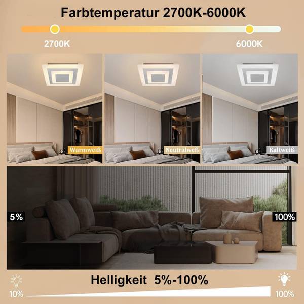 [Dimbare plafondlamp] U kunt de helderheidsniveaus en kleurtemperaturen aanpassen – warm wit, neutraal wit en koel wit (3000K-6000K) – met de afstandsbediening.