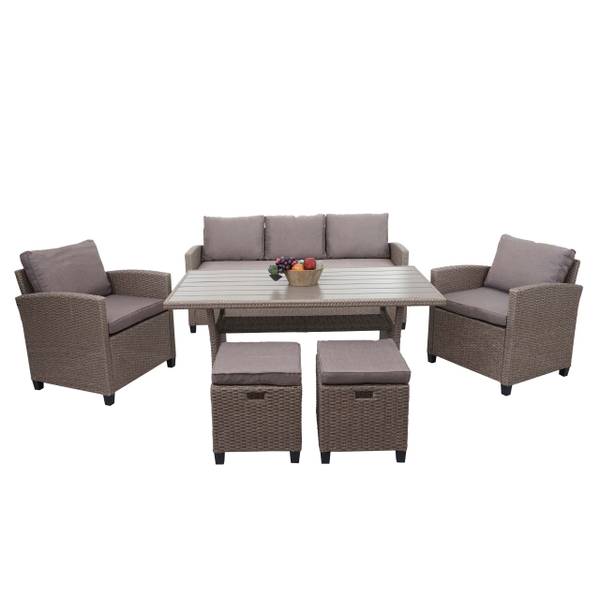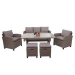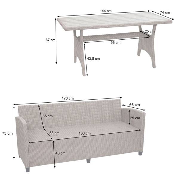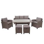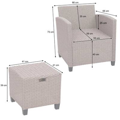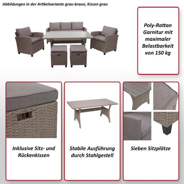 Vindt u het leuk om zomeravonden met vrienden en familie in de tuin door te brengen en houdt u van stijlvol en toch comfortabel? Dan is deze tuinlounge echt iets voor jou! Of het nu tuin, terras of balkon is - deze tijdloze poly-rattan set slaat altijd een goed figuur en past naadloos in elke omgeving. Hij bestaat uit een bank, een tafel, twee fauteuils en twee krukjes en biedt veel ruimte voor familie, vrienden en bezoekers.