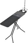 Op de tafel bevindt zich een strijkijzerhouder met siliconen onderdelen die uw strijkijzer beschermen en een snoerhouder die ervoor zorgt dat het snoer tijdens het strijken niet in de weg zit.