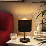 Technische details: Afmetingen: ca. 19 x 31,6 cm. Diameter voet: 15 cm. Afmetingen lampenkap: 19 x 16 cm. Kleur: zwart en goud. Lichtbron: max. 40 W. Voltage: 230 V. Materiaal: ijzer en textiel. Voeding en stekker: elektrisch met snoer.