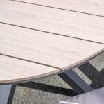 Het frame is fraai vormgegeven door de kruis tafelpoten die schuin onder de tuintafel zijn geplaatst, hierdoor krijgt de tuintafel een speciaal en uniek uiterlijk. Het tafelblad is gemaakt van Vironwood latten, dit is een onderhoudsvriendelijke kunststof met een mooie houtuitstraling. De tuintafel heeft een doorsnede van 122 cm en is 75 cm hoog. De tuinstoel is 74 bij 66 cm en is 86 cm hoog.