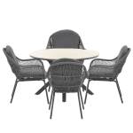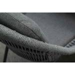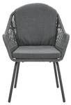 De tuinstoel heeft een frame gemaakt van aluminium met daar omheen gevlochten touw. Dit touw kun je vergelijken met touw wat in de scheepsvaart gebruikt wordt, erg stevig dus. Het touw is voorzien van een rubberen kern binnenin met daarin meerdere polyester draden voor de stevigheid. Om de rubberen kern zit solution dyed polyester rope. Dit betekent dat het touw door en door gekleurd is en verkleurt veel minder snel. Net als de tuinstoel is het onderstel van de tuintafel ook gemaakt van aluminium.