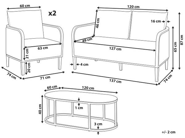 Afmetingen 2-zitsbank: 137x74x87